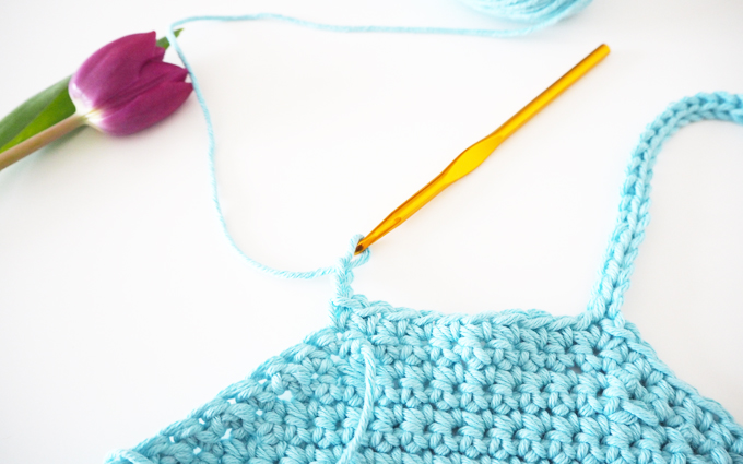 Once you reach the bodice of the top again, double crochet into the same stitch you left on then begin working along the top in double crochet until you reach the stitch the second strap needs to go in.